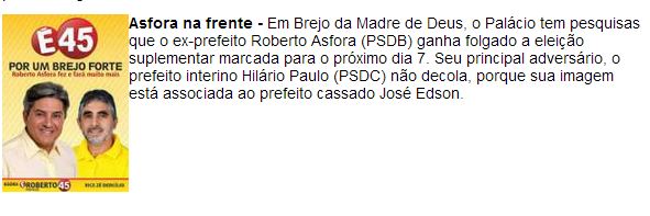 O jornalista Magno Martins publicou em seu Blog, na manhã deste sábado (22), a notícia de que Roberto Asfora (PSDB) pode vencer a eleição suplementar em Brejo da Madre de Deus. O jornalista afirmou que supostas pesquisas encomendadas pelo Palácio do Campo das Princesas apontariam esse resultado.